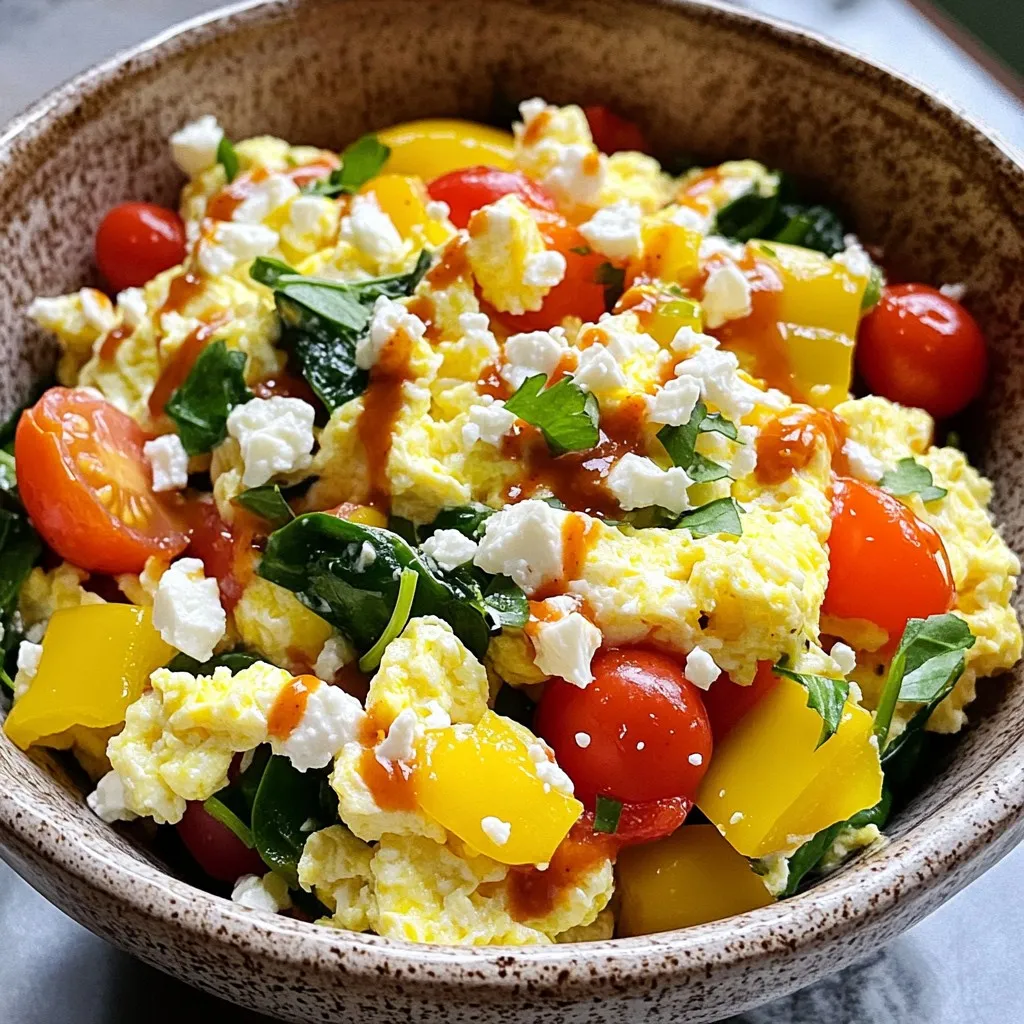 The main ingredients for my Minute Egg White Scramble Bowl create a tasty dish. The egg whites offer a light base, while the colorful veggies add crunch and flavor. Bell peppers bring a sweet taste and look great. Green onions give a fresh bite, and tomatoes add a hint of sweetness. Spinach gives a healthy boost. Feta cheese brings a tangy kick that makes the dish shine. Don’t forget the salt and pepper to enhance all the flavors!
