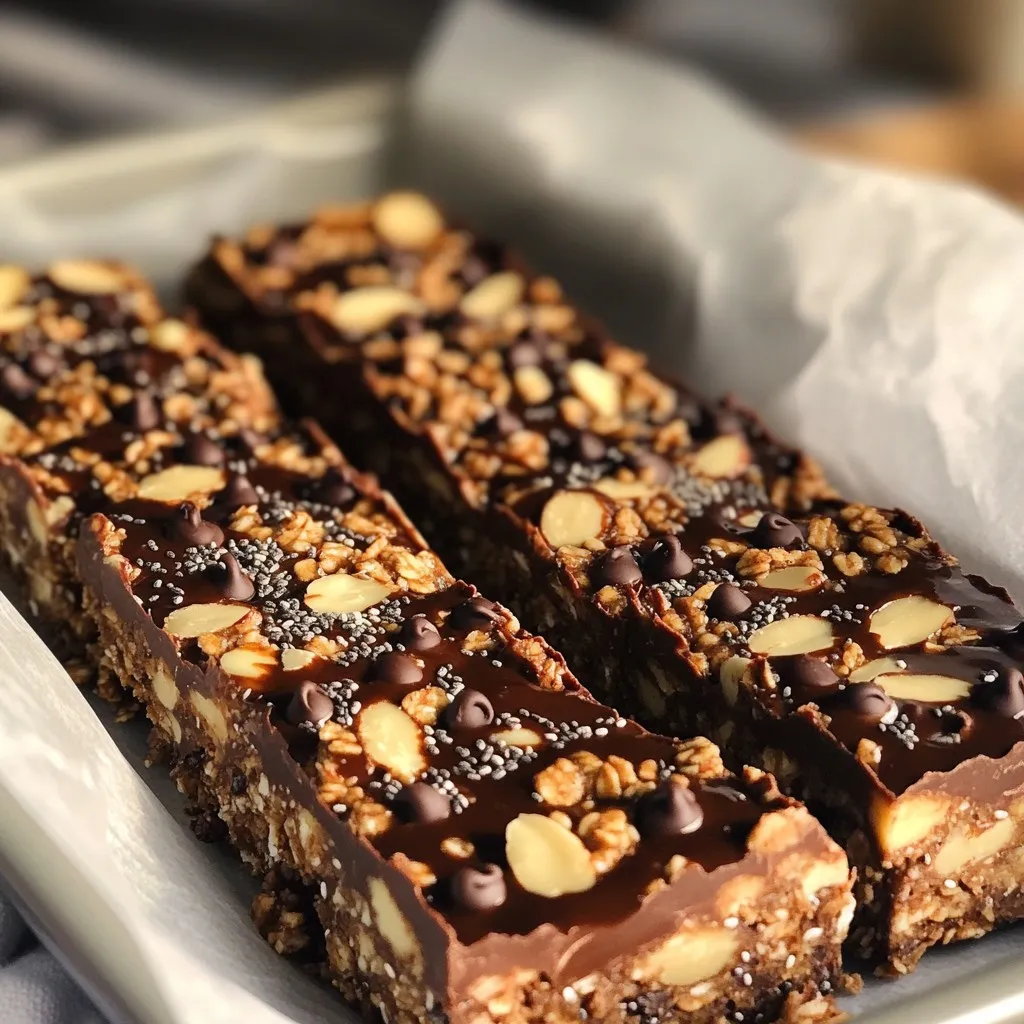 These ingredients make a tasty treat. Rolled oats provide a great base. Almond butter gives a creamy texture and nutty flavor. The honey or maple syrup adds sweetness. Dark chocolate chips bring a rich taste, while chopped almonds add crunch. Chia seeds offer nutrition and help bind the bars. Vanilla extract enhances the flavor, and sea salt balances the sweetness.