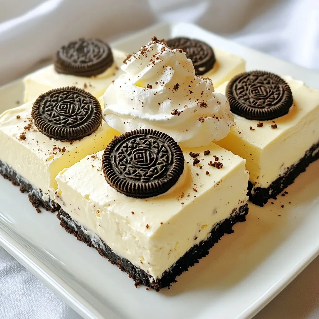 Delicious no-bake cheesecake bars made with Oreo cookies and a creamy filling.