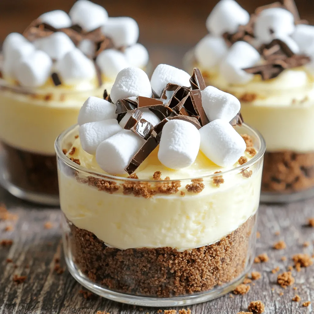 Spoon the cheesecake mixture over the crust in each cup. Fill them all the way to the top. Use a spatula or spoon to smooth the tops. Now, place the cheesecake cups in the refrigerator. Let them chill for at least 2-3 hours. This helps the cheesecake set firmly. Once set, remove them from the fridge. Decorate each cup with more mini marshmallows and chocolate shavings. For a fun twist, try toasting a few mini marshmallows with a kitchen torch before placing them on top. This adds a nice touch of s’mores flavor.