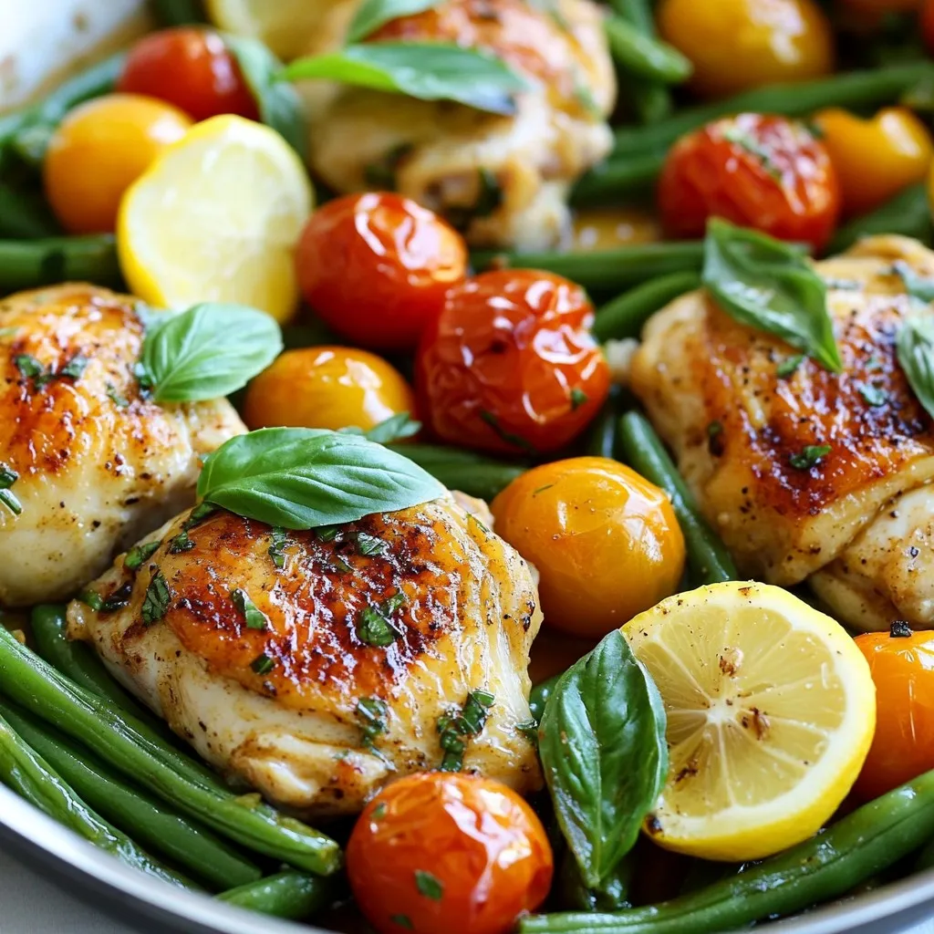 A flavorful and colorful one-pan meal featuring marinated chicken thighs, fresh green beans, and cherry tomatoes.