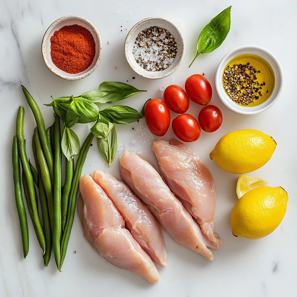 – Layering Ingredients: Lay the chicken thighs flat in the pan. Leave space around them. This helps them cook well. Add green beans and cherry tomatoes around the chicken. This makes the dish colorful and tasty.