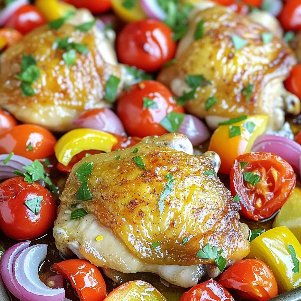 - 4 bone-in chicken thighs, skin-on - 2 tablespoons extra-virgin olive oil - 1 teaspoon sweet paprika - 1 teaspoon dried oregano - 1 teaspoon garlic powder - 1 cup cherry tomatoes, halved - 1 bell pepper, sliced (any color, such as red, yellow, or green) - 1 medium red onion, cut into wedges - 1 cup Kalamata olives, pitted and halved - Fresh parsley, finely chopped (for garnish) - Juice and zest of 1 large lemon - Salt and freshly cracked black pepper The key to this dish is using quality ingredients. The bone-in chicken thighs bring rich flavor and moisture. I prefer skin-on thighs because they crisp up nicely in the oven. The extra-virgin olive oil adds a fruity taste that enhances the dish. Sweet paprika and garlic powder lend warmth and depth. Dried oregano gives it that classic Mediterranean touch. For the veggies, I love using halved cherry tomatoes. They burst with juice as they roast. Sliced bell peppers add sweetness and color. The red onion caramelizes beautifully, giving a rich flavor contrast. Kalamata olives add briny goodness, making every bite exciting. Lemon juice and zest brighten the dish. They cut through the richness and tie all flavors together. Salt and freshly cracked black pepper are essential. They help to balance all the tastes in this vibrant meal. - Preheat your oven to 400°F (200°C). - In a large bowl, mix the olive oil, sweet paprika, dried oregano, garlic powder, salt, pepper, lemon juice, and zest. Whisk until smooth. - Add the chicken thighs to the marinade. Make sure each thigh is well coated. - Let the chicken marinate for at least 20 minutes. For better flavor, marinate overnight in the fridge. - Place the marinated chicken thighs skin-side up in an oven-safe skillet. - Add cherry tomatoes, bell pepper, onion wedges, and Kalamata olives around the chicken. - Pour any leftover marinade over the vegetables. - Roast everything in the oven for 35-40 minutes. The chicken is ready when it hits 165°F (75°C) and is golden brown. - Once cooked, take the pan out of the oven. Let the chicken rest for 5 minutes. - Sprinkle chopped parsley over the dish to add color. Serve the chicken hot with roasted veggies and olives. To get the best flavor, marinate your chicken thighs well. Use a big bowl for mixing. Combine olive oil, spices, salt, and lemon juice. Whisk until it’s smooth. Add the chicken and coat each piece. Let it sit for at least 20 minutes. For deeper taste, marinate overnight in the fridge. This helps the flavors soak in. For crispy skin, make sure you start with dry chicken. Pat it dry with paper towels before marinating. When cooking, place the chicken skin-side up in the skillet. The oven should be hot at 400°F (200°C). Roast for 35-40 minutes until golden brown. Use a meat thermometer to check. The chicken must reach 165°F (75°C) inside to be safe. Serving family-style makes it fun. Keep the chicken and veggies in the skillet. This way, everyone can help themselves. Add lemon wedges on the side. They brighten the dish and add extra zest. You can also sprinkle fresh parsley on top for color. This makes your meal look as good as it tastes. {{image_4}} You can switch up the veggies in this dish. Try using zucchini or asparagus for a fresh twist. Carrots can also add sweetness and color. If you're not in the mood for chicken, you can use bone-in pork chops or even firm tofu. Both options will soak up the flavors well. To kick up the flavor, consider adding spices like cumin or coriander. Fresh herbs, such as thyme or rosemary, can also brighten the dish. For marinades, mix in some yogurt or honey for a unique taste. You can even add a splash of balsamic vinegar for a tangy kick. This dish pairs well with fragrant rice or a light couscous salad. A crunchy green salad with lemon vinaigrette can balance the rich chicken. For wine, a chilled Sauvignon Blanc or a light Pinot Grigio complements the meal nicely. Both wines enhance the lemony notes in the chicken. After you enjoy your One-Pan Mediterranean Lemon Chicken Thighs, save any leftovers. Place the chicken and vegetables in an airtight container. This helps keep them fresh. Store in the fridge for up to three days. If you want to keep them longer, freezing is a great option. To reheat, I recommend using an oven or a skillet. Preheat your oven to 350°F (175°C). Place the chicken and veggies on a baking sheet. Heat for about 15-20 minutes. This keeps the chicken juicy and the skin crispy. If you use a skillet, heat on medium-low. Add a splash of water or broth to keep moisture. Stir gently to warm up. Yes, you can freeze this dish! To freeze, let the chicken and veggies cool completely. Place them in freezer-safe bags or containers. Make sure to remove as much air as possible. This helps prevent freezer burn. You can freeze for up to three months. When you’re ready to eat, thaw in the fridge overnight. Reheat as mentioned before for best flavor and texture. You should marinate chicken thighs for at least 20 minutes. For the best taste, let them sit overnight in the fridge. This time allows the flavors to soak in deeply. Yes, you can use boneless chicken thighs. They will cook faster, so reduce roasting time by about 10 minutes. Always check the internal temperature for safety. If you don’t have Kalamata olives, try green olives or black olives. Each type adds a unique taste, but they all work well in this dish. Check the internal temperature of the chicken thighs. They are done when they reach 165°F (75°C). The skin should also look crispy and golden brown. Yes, you can cook this dish in a slow cooker. Place the marinated chicken and vegetables in the slow cooker. Cook on low for 6-8 hours or on high for 3-4 hours. This recipe highlights simple, fresh ingredients, like chicken thighs and vibrant vegetables. You learned how to prepare, marinate, and roast your dish for perfect flavor. Remember to use fresh herbs and seasonings for a tasty finish. Feel free to mix in different veggies or p
