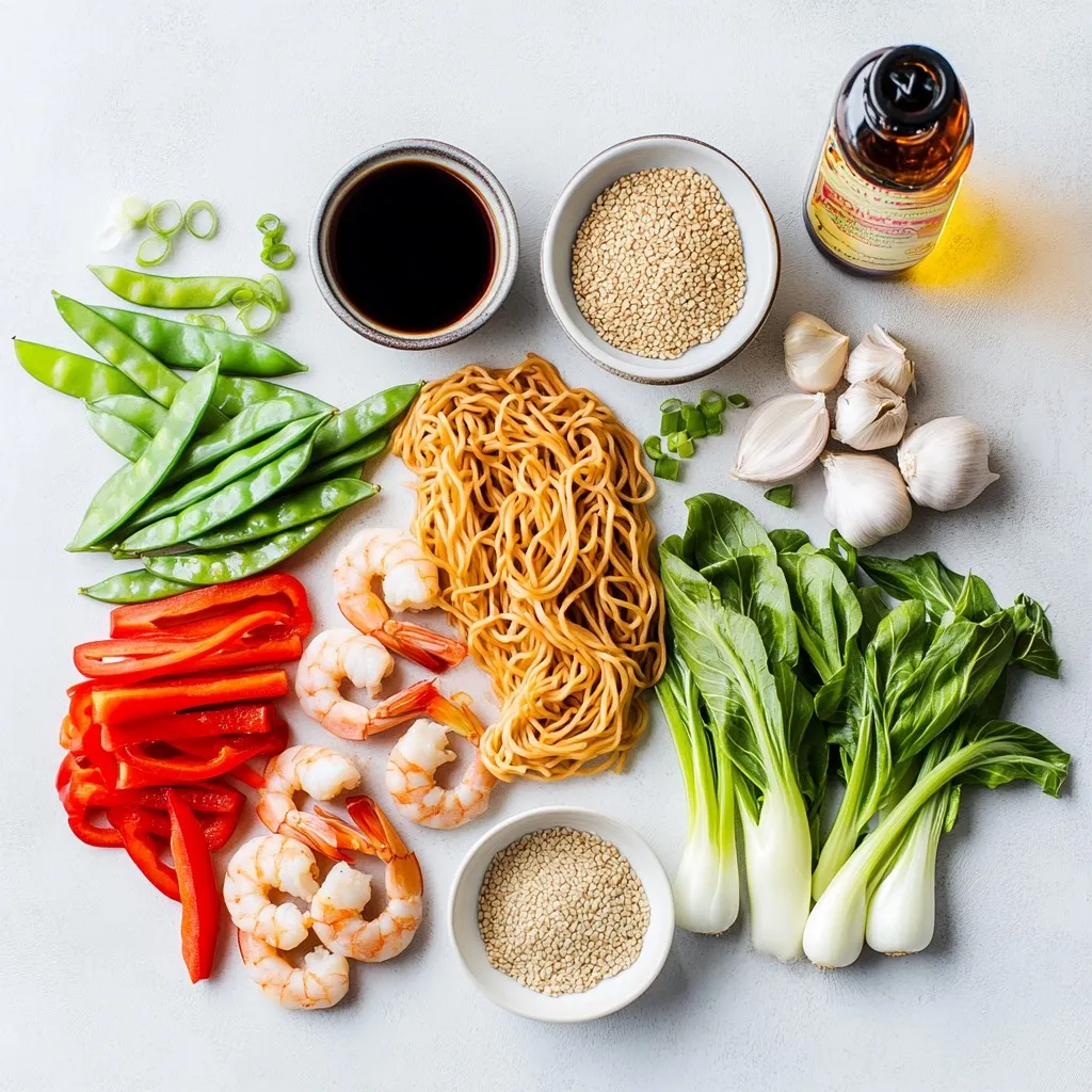 Lo mein noodles are the star here. They are soft and chewy. You can find them in most grocery stores. Large shrimp bring a sweet and tender bite. Peel and devein them for the best taste. Fresh vegetables add color and crunch. Red bell pepper gives sweetness, while snap peas add a snap. Baby bok choy adds a slight bitterness and great texture.