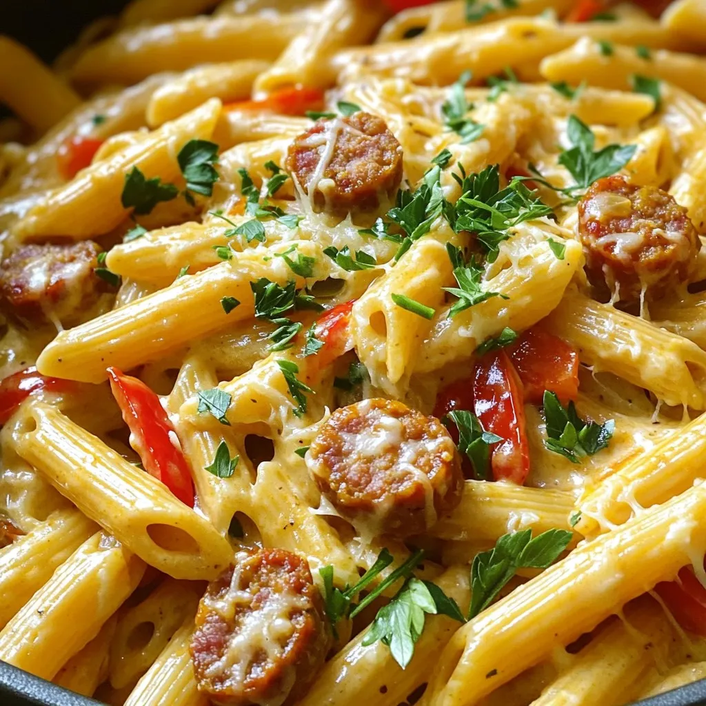 The heart of this dish is the combination of penne pasta and smoked sausage. Penne holds onto the sauce well. Smoked sausage adds a rich, savory flavor. Diced onion and garlic build a fragrant base. The red bell pepper gives a sweet crunch.