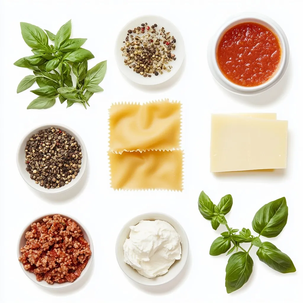 Start by gathering your ingredients. You need olive oil, onion, garlic, ground beef or turkey, dried oregano, dried basil, red pepper flakes, crushed tomatoes, broth, lasagna noodles, ricotta cheese, mozzarella cheese, Parmesan cheese, salt, and pepper.