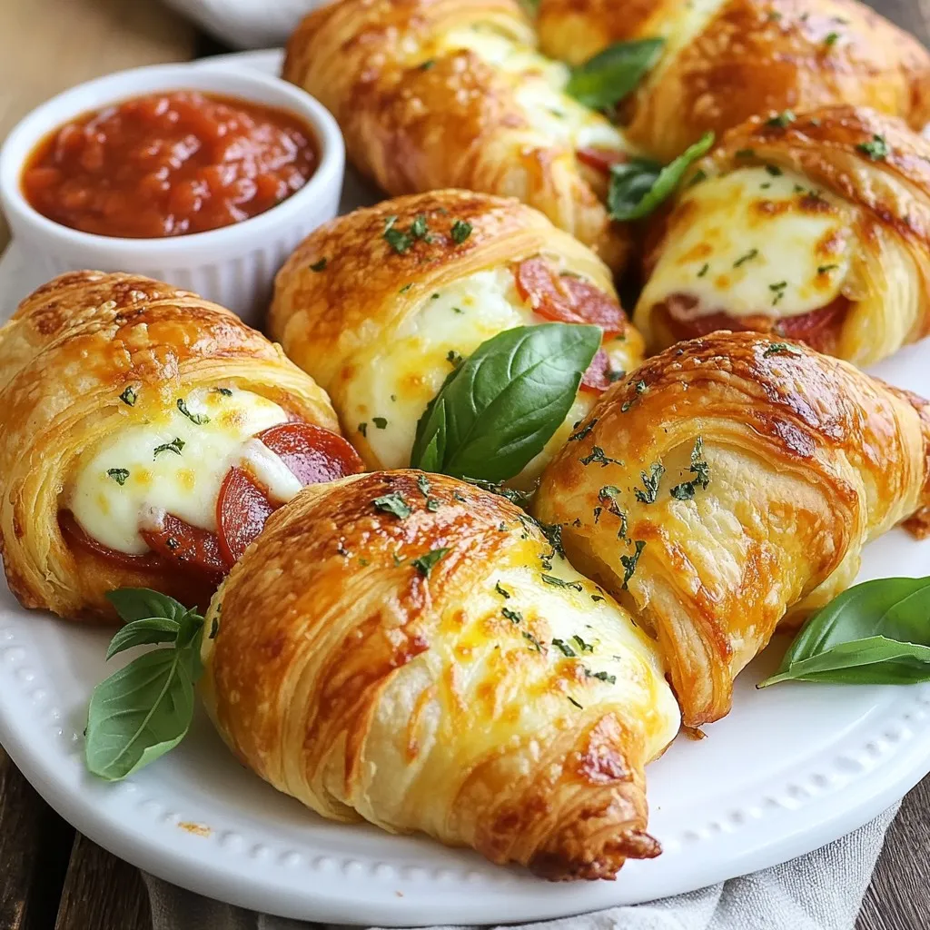 - 1 package (8 ounces) refrigerated crescent roll dough - 1 cup shredded mozzarella cheese - 1/2 cup sliced pepperoni - 1/4 cup pizza sauce (plus extra for dipping) - 1 teaspoon dried Italian herbs (like oregano and basil) - 1/4 teaspoon garlic powder - 1 egg (for egg wash) - Fresh basil leaves (for garnish, optional) You can swap the crescent roll dough for puff pastry if you want a flakier roll. Instead of mozzarella, try provolone or cheddar cheese for a different taste. If you want a meat-free option, use mushrooms or spinach in place of pepperoni. For a bit of spice, add sliced jalapeños. When it comes to herbs, any Italian blend works well. If you lack pizza sauce, marinara or a homemade sauce will do just fine. You will need a few basic tools: - A baking sheet - Parchment paper - A small bowl for the egg wash - A pastry brush to apply the egg wash - A spoon for spreading sauce and filling - A clean, flat surface to roll out the dough This simple list keeps your cooking stress-free. Gather these items before you start. Happy cooking! {{ingredient_image_2}} First, you need to preheat your oven to 375°F (190°C). This step is key for getting a great bake. Next, grab your package of refrigerated crescent roll dough. Unroll it on a clean surface and separate it into triangles. Each triangle should be easy to spot. This is how you will create your rolls. Now it’s time to add flavor. Take a spoon and spread a thin layer of pizza sauce on each triangle. Be sure to leave about half an inch along the edges. This space helps seal the rolls later. Next, sprinkle shredded mozzarella cheese on the sauce. Add a few slices of pepperoni on top of the cheese. For extra flavor, add a pinch of dried Italian herbs and a sprinkle of garlic powder. To shape the croissant rolls, start at the wide end. Gently roll the dough towards the pointed end. Tuck the filling snugly inside as you roll. Pinch the edges together to seal them well. This helps keep the delicious filling inside during baking. Place your rolled croissants on a baking sheet lined with parchment paper. Make sure to leave space between each one. This allows them to rise and get crispy. In a small bowl, beat an egg. Use a pastry brush to apply a nice egg wash on top. This will make your rolls golden and shiny when baked. Now, it’s time to bake! Put the baking sheet in your preheated oven. Bake for 12 to 15 minutes. Keep an eye on them until they turn a lovely golden brown. When they are done, take them out and let them cool slightly. These croissant rolls are best enjoyed warm with extra pizza sauce for dipping. To make your Pepperoni Mozzarella Croissant Rolls truly shine, I have some handy tips. Start with fresh ingredients. Use high-quality mozzarella cheese for the best melt. The pepperoni should be thick-cut for a bold flavor. Always spread the pizza sauce evenly. This will prevent sogginess. Don't overfill the croissants. You want a snug roll without any leaks. Lastly, pinch the edges tightly to seal in the goodness. For a crispy, golden finish, preheat your oven well to 375°F (190°C). Line your baking sheet with parchment paper. This helps the croissants bake evenly without sticking. Apply a generous egg wash on top. This gives that nice shine and crispiness. Bake the rolls until they are golden brown, usually 12-15 minutes. If you want extra crunch, broil them for one minute at the end. Watch closely to avoid burning. Serve your croissant rolls warm for the best taste. Pair them with extra pizza sauce for dipping. You can also try a sprinkle of fresh herbs like basil after baking for a fresh touch. For a fun twist, serve with a side of ranch or garlic butter. This adds a new layer of flavor and makes them more enjoyable. Present them on a bright platter to make your meal pop! Pro Tips Use Fresh Ingredients: Opt for fresh mozzarella cheese and high-quality pepperoni for the best flavor and texture in your croissant rolls. Customize Your Fillings: Feel free to experiment with different fillings such as veggies, other types of cheese, or even cooked sausage to suit your taste. Control the Dough Temperature: Make sure your crescent roll dough is cold before rolling it out. This helps maintain its flakiness while baking. Serve Immediately: These croissant rolls are best enjoyed warm and fresh from the oven. Serve them as soon as they cool slightly for the best experience. {{image_4}} You can switch up the filling for fun! Try using cooked sausage for a meaty touch. Chicken or ham also works great. Want something different? Use veggies like spinach or mushrooms for a fresh bite. You could even add some caramelized onions for sweetness. Cheese lovers can mix in cheddar or pepper jack for a zesty kick. The options are endless! If you want a meat-free version, you can easily make this dish vegetarian. Instead of pepperoni, use roasted red peppers or artichoke hearts. Add some spinach or zucchini for crunch. You can also try using a blend of different cheeses like feta and mozzarella. These choices still give you that tasty, cheesy goodness without meat. For those who enjoy some heat, spice things up! Add jalapeños or crushed red pepper flakes to your filling. Hot Italian sausage can bring a nice kick too. You could even smear some sriracha on the dough before adding cheese and toppings. The heat will make your taste buds dance! To store leftover croissant rolls, let them cool first. Place them in an airtight container. This helps keep them fresh. You can also wrap them in plastic wrap. Store the container in the fridge for up to three days. When you want to enjoy your leftover croissant rolls, preheat your oven to 350°F (175°C). Place the rolls on a baking sheet. Heat them for about 10 minutes. This warms them through and helps keep them crispy. If you are in a hurry, you can use a microwave. Microwave them for 20-30 seconds, but they may not be as crispy. For long-term storage, you can freeze the croissant rolls. Wrap each one in p