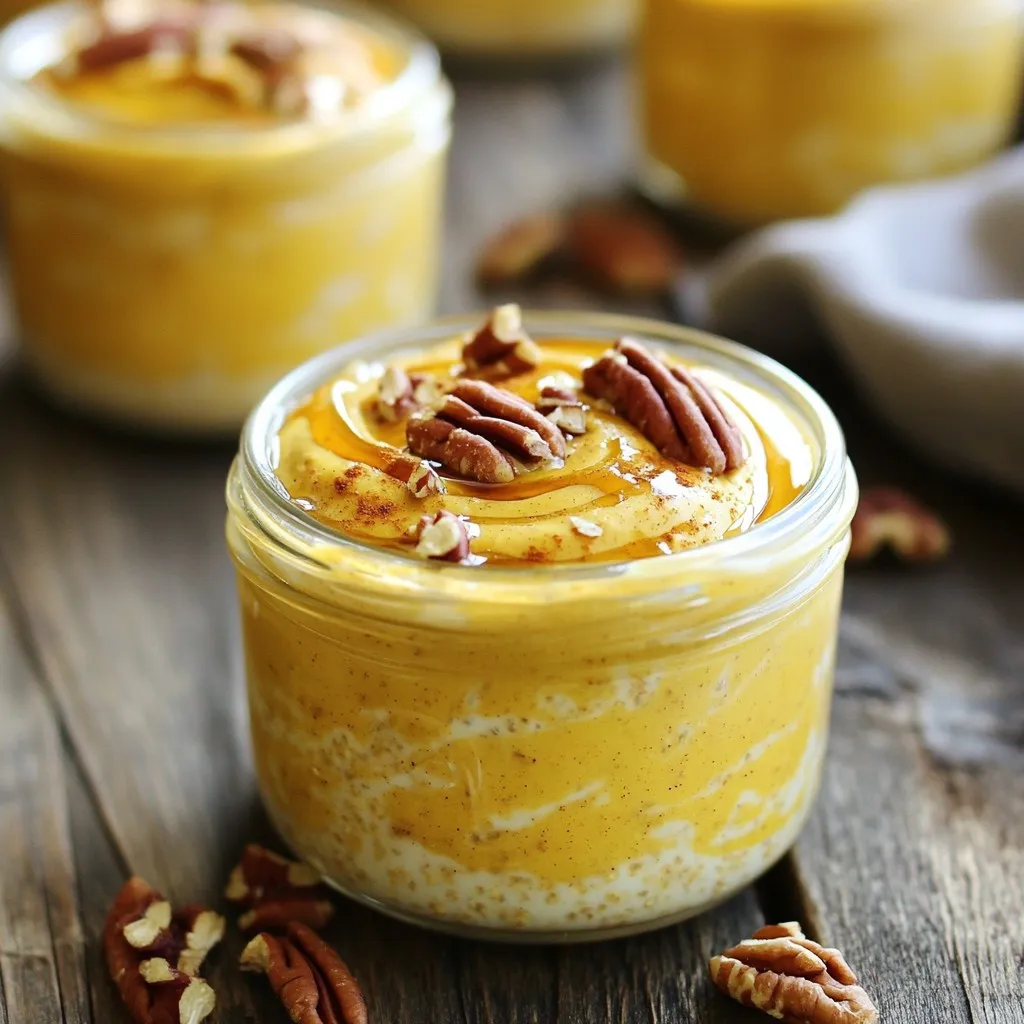 When morning comes, take the jars from the fridge. Give the oats a good stir. This step mixes all the lovely flavors together. If you want a creamier texture, add a splash of almond milk. Then it’s time to add some crunch! Sprinkle chopped pecans or walnuts on top. If you like, add a dollop of Greek yogurt for extra creaminess. Enjoy your Protein Pumpkin Pie Overnight Oats straight from the fridge or warm them up in the microwave for a cozy breakfast!
