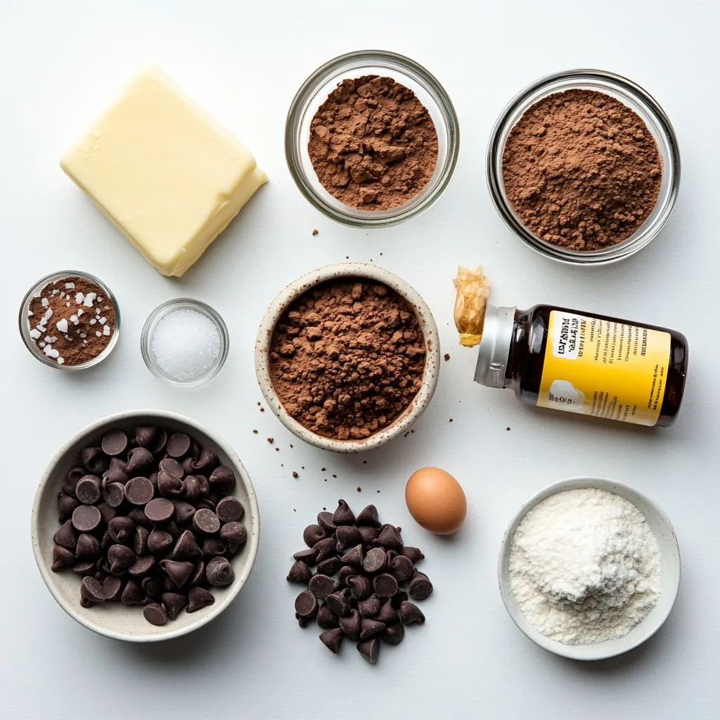 First, gather your ingredients. You will need chocolate chips, butter, eggs, sugar, vanilla, flour, cocoa powder, baking powder, and sea salt flakes. The prep time is just 15 minutes. You can make 24 cookies, perfect for sharing.