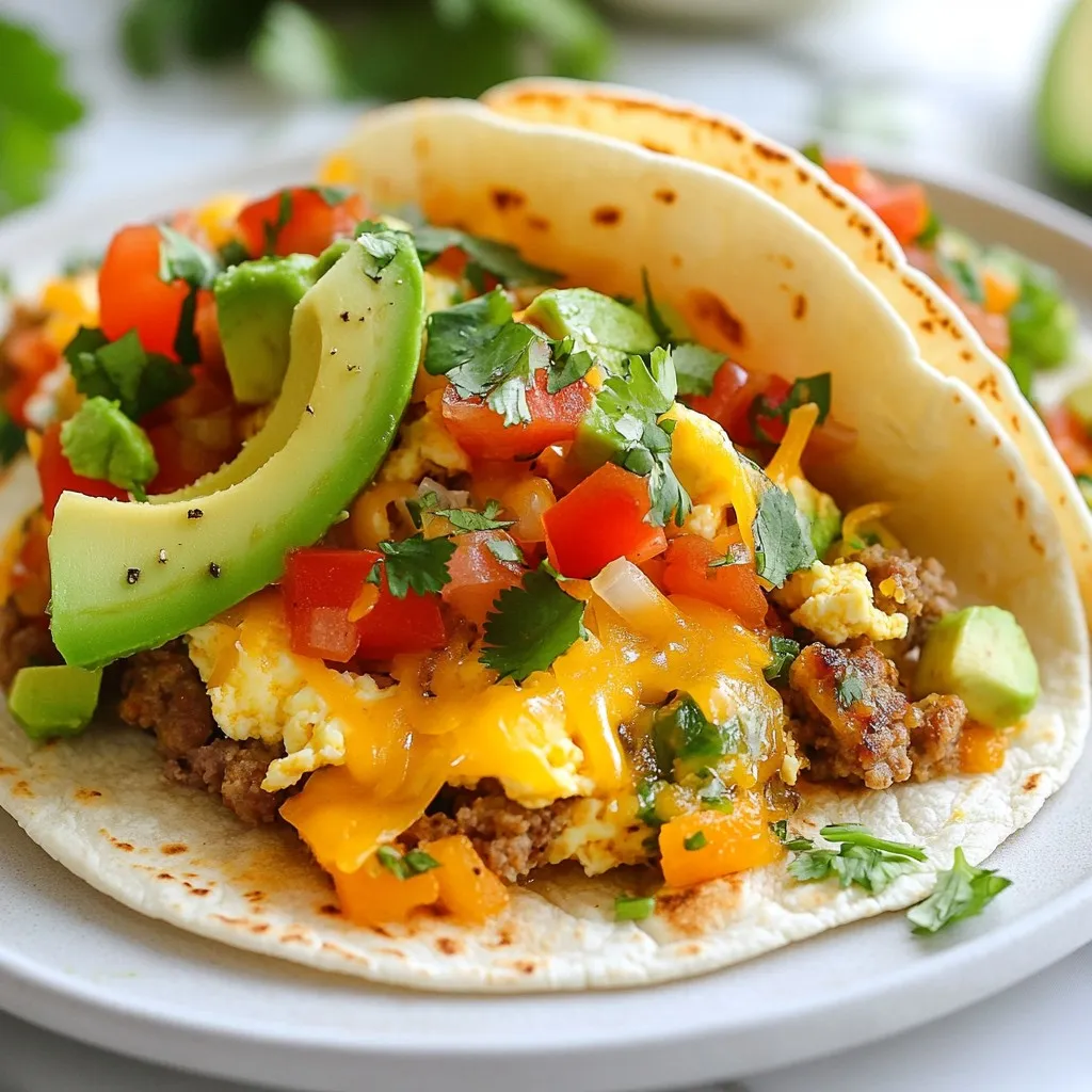- 1 lb breakfast sausage - 6 large eggs - 1 cup shredded cheddar cheese - 1 cup diced bell peppers - 1/2 cup finely diced onions - 1 can (4 oz) diced green chiles - 1 tsp garlic powder - 1 tsp ground cumin - Salt and black pepper to taste - Fresh cilantro - Avocado slices For this recipe, start with the main ingredients. I use breakfast sausage for a savory base. Six large eggs create a fluffy filling. Shredded cheddar cheese adds a creamy touch. I love using a mix of colorful bell peppers for flavor and fun. Finally, some finely diced onions give depth to the dish. Next, we add seasoning and garnish. Diced green chiles bring a mild heat that enhances the dish. Garlic powder and ground cumin offer warmth and depth. Don't forget to season with salt and black pepper to taste. Fresh cilantro adds brightness, while ripe avocado slices provide creaminess. These add-ons make each bite special and fresh. This ingredient list helps you build a tasty and satisfying meal. You can easily find these items at your local store. They combine to create a hearty breakfast taco that everyone will love! {{ingredient_image_2}} - Cooking breakfast sausage: Start by crumbling 1 pound of breakfast sausage into a medium skillet. Cook over medium heat for 6-8 minutes until it is browned and fully cooked. Drain any grease before moving the sausage to the slow cooker. - Whisking eggs with vegetables and seasonings: In a large mixing bowl, crack 6 large eggs. Whisk them until they are well beaten. Next, add 1 cup of diced bell peppers, 1/2 cup of finely diced onions, and 1 can of drained diced green chiles. Season with 1 teaspoon each of garlic powder and ground cumin. Add salt and freshly cracked black pepper to your taste. Stir well to combine everything. - Layering ingredients in the slow cooker: Carefully pour the egg mixture over the cooked sausage in the slow cooker. Spread it evenly so every bite gets flavor. - Cooking times for low and high settings: Cover the slow cooker with its lid. Set it to cook on low for 4 hours or high for 2 hours. The eggs are done when they have set and cooked through. Stir occasionally to ensure even cooking. - Adding shredded cheese: Once the taco filling is fully cooked, sprinkle 1 cup of shredded cheddar cheese on top. Cover the slow cooker again and let it sit on warm for about 10 minutes. This lets the cheese melt nicely. - Warming tortillas: While the cheese melts, warm 8 small flour tortillas. You can do this in a dry skillet over medium heat for about 30 seconds on each side. Alternatively, microwave them for 20 seconds until they are soft. - Assembling and garnishing the tacos: To assemble, take a warm tortilla and spoon a generous amount of the breakfast mixture in the center. Add fresh cilantro and a couple of avocado slices for creaminess and extra flavor. - Best sausage to use: I recommend using a mild breakfast sausage. It gives a great flavor and won’t overpower the dish. If you like spice, try a hot sausage for a kick. - How to avoid overcooking the eggs: Keep an eye on your slow cooker. Cook on low for 4 hours or high for 2 hours. Stir occasionally to ensure even cooking. - Presentation ideas for serving: Serve the tacos on a bright platter. Add extra cilantro and avocado slices on the side. This allows guests to customize their tacos. A drizzle of hot sauce adds a nice touch and some heat. - Pairing drinks with breakfast tacos: A fresh juice or a light coffee pairs well. If you want something fun, try a mimosa or a spicy Bloody Mary. - Substitutions for vegetables: You can swap bell peppers for zucchini or spinach. Both add color and flavor. Feel free to mix in your favorite veggies based on what you have. - Adding different types of cheese: While cheddar cheese is classic, you can try pepper jack for spice or a creamy Monterey Jack for a milder taste. Each cheese brings its own unique flavor to the tacos. Pro Tips Use Fresh Ingredients: Opt for fresh, locally sourced vegetables and high-quality sausage for the best flavor in your breakfast tacos. Customize Your Spice Level: Adjust the heat by adding more or fewer diced green chiles or incorporating jalapeños for an extra kick. Perfectly Warm Tortillas: Warm tortillas in a skillet instead of the microwave to achieve a better texture and flavor. Make Ahead: Prepare the filling a day in advance and store it in the refrigerator. Reheat in the slow cooker before serving for a quick breakfast option. {{image_4}} You can switch up the meat in your tacos. Try using turkey or chicken sausage instead of regular sausage. These options are leaner and still pack great flavor. If you want a vegetarian choice, black beans work well too. They add protein and a nice texture. Simply replace the sausage with a can of rinsed black beans. You’ll still enjoy a hearty taco! Want to add a little zing? Try adding spices like paprika or chili powder. These spices boost the flavor and give your dish a warm kick. You can also experiment with different types of peppers. Jalapeños or poblano peppers add heat. If you prefer milder options, go for bell peppers. The choice is yours! If you need gluten-free options, look for gluten-free tortillas. Many brands offer tasty choices that work great in tacos. For those avoiding dairy, consider using dairy-free cheese. There are many brands that melt nicely and taste great. These swaps let everyone enjoy breakfast tacos, no matter their diet! To keep your breakfast tacos fresh, store them in an airtight container. Make sure to cool them down before you put them in the fridge. Breakfast tacos can last up to three days in the fridge. Always check for any off smell or change in texture before eating. If you want to freeze the taco filling, let it cool first. Then, place it in a freezer-safe bag. Try to remove as much air as possible to avoid freezer burn. The filling can last up to three months in the freezer. When you're ready to eat, thaw it overnight in the fridge. Reheat it on the stove or in 
