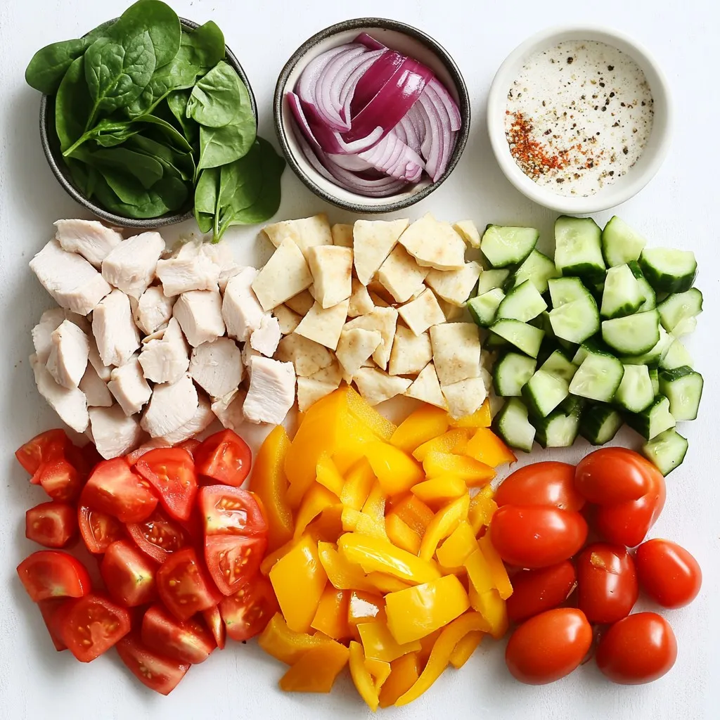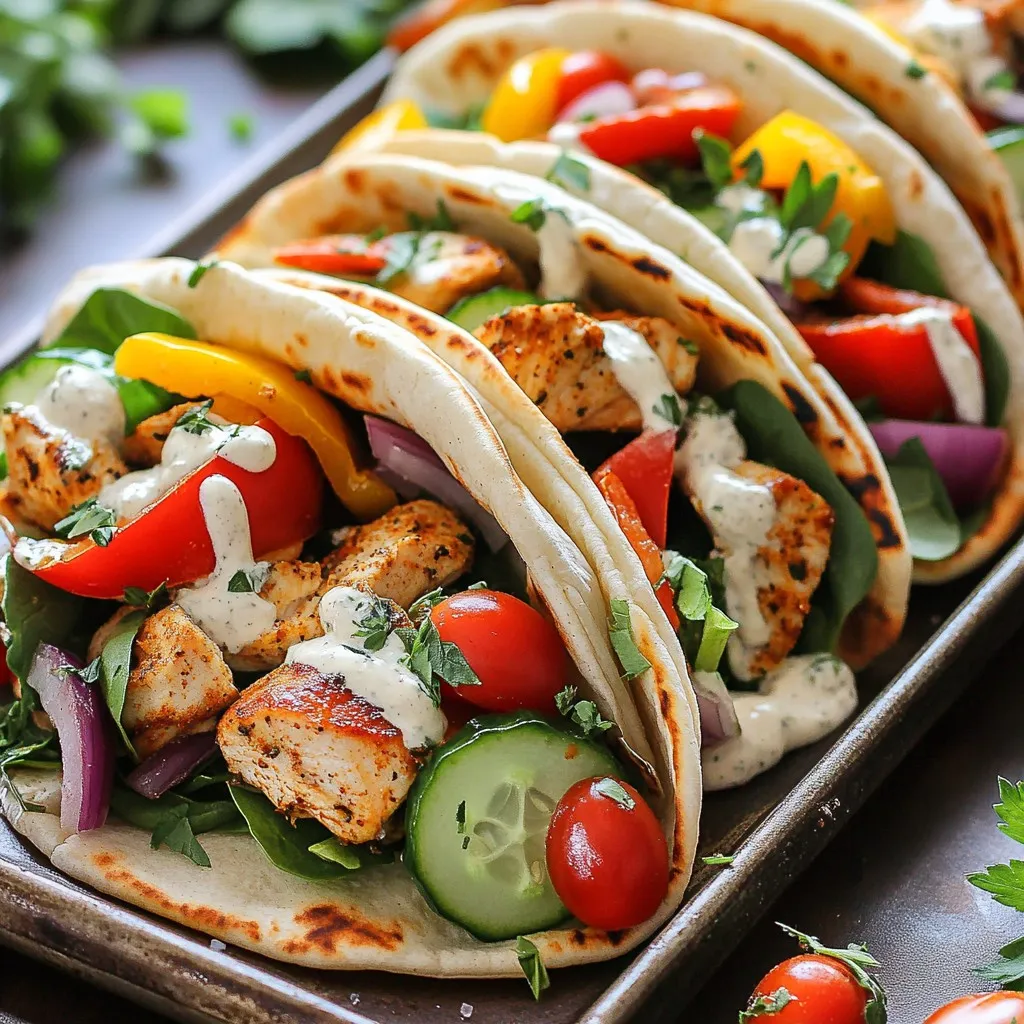 These ingredients create a balanced and flavorful dish. The chicken provides protein, while the fresh veggies add crunch and color. Whole wheat pita breads offer a hearty base, making each bite satisfying.