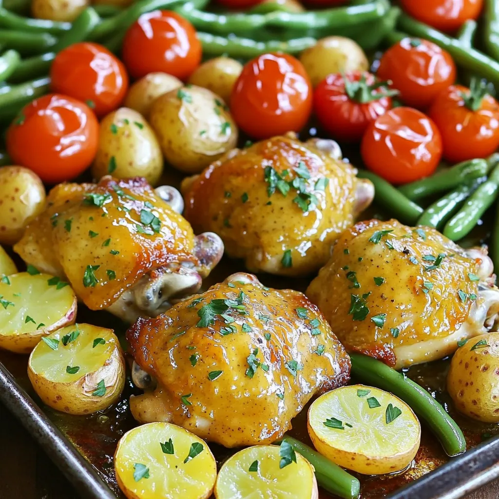 Now, place the marinated chicken thighs around the potatoes, skin-side up. Keep space between each piece. This helps them cook evenly. Finally, scatter the halved cherry tomatoes and green beans around the chicken and potatoes. Drizzle the remaining marinade over everything. Toss the veggies gently to coat them.
