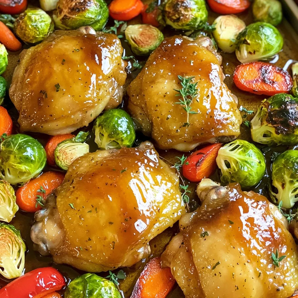 Now, pop the sheet pan into your preheated oven. Roast everything for 35-40 minutes. The chicken is done when it reaches an internal temperature of 165°F (75°C) and has crispy, golden skin. During this time, the veggies will caramelize and become tender. Once done, take the sheet pan out and let it rest for about 5 minutes. This helps the chicken’s juices settle. If you want, sprinkle fresh thyme over the dish for a nice touch. Enjoy your meal!