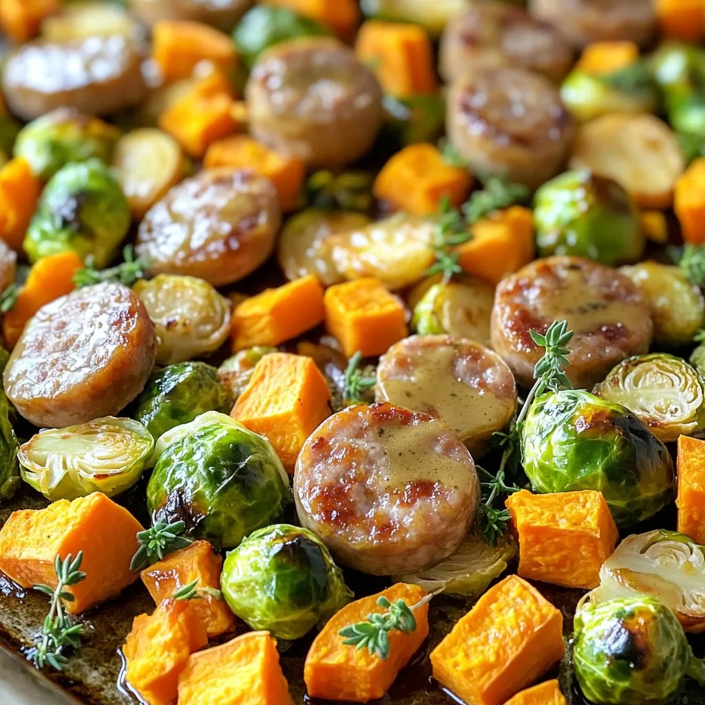 Enjoy a delicious and easy dinner with this Sheet-Pan Maple Dijon Sausage & Veggies recipe! Featuring juicy sausages, vibrant Brussels sprouts, sweet potatoes, and a tasty maple-Dijon glaze, this dish is perfect for busy nights. With just one pan and 35 minutes, you can create a satisfying meal that the whole family will love. Click through to explore the full recipe and bring this flavorful dish to your table tonight!