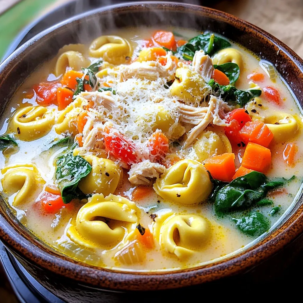 These ingredients create a rich blend of flavors and textures. The chicken provides protein, while the tortellini adds heartiness. Fresh spinach and carrots bring color and nutrients.