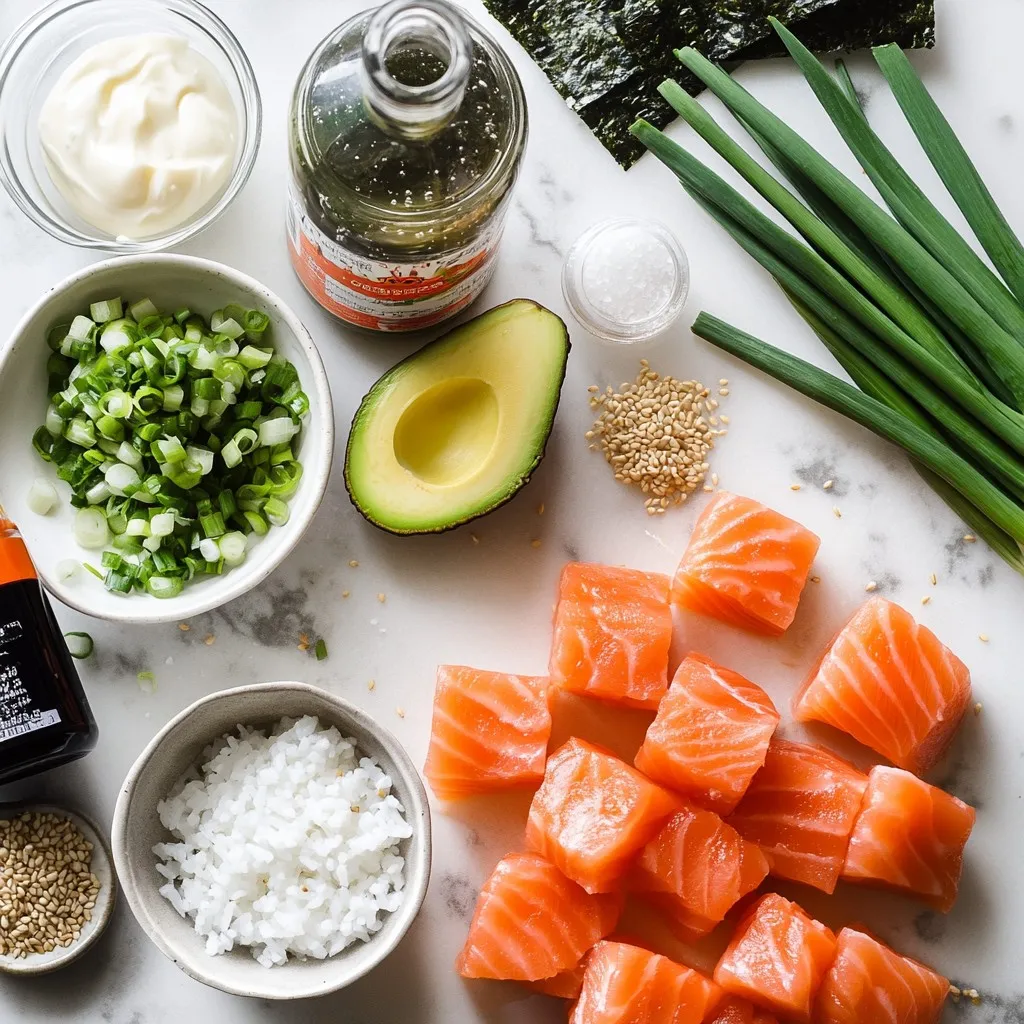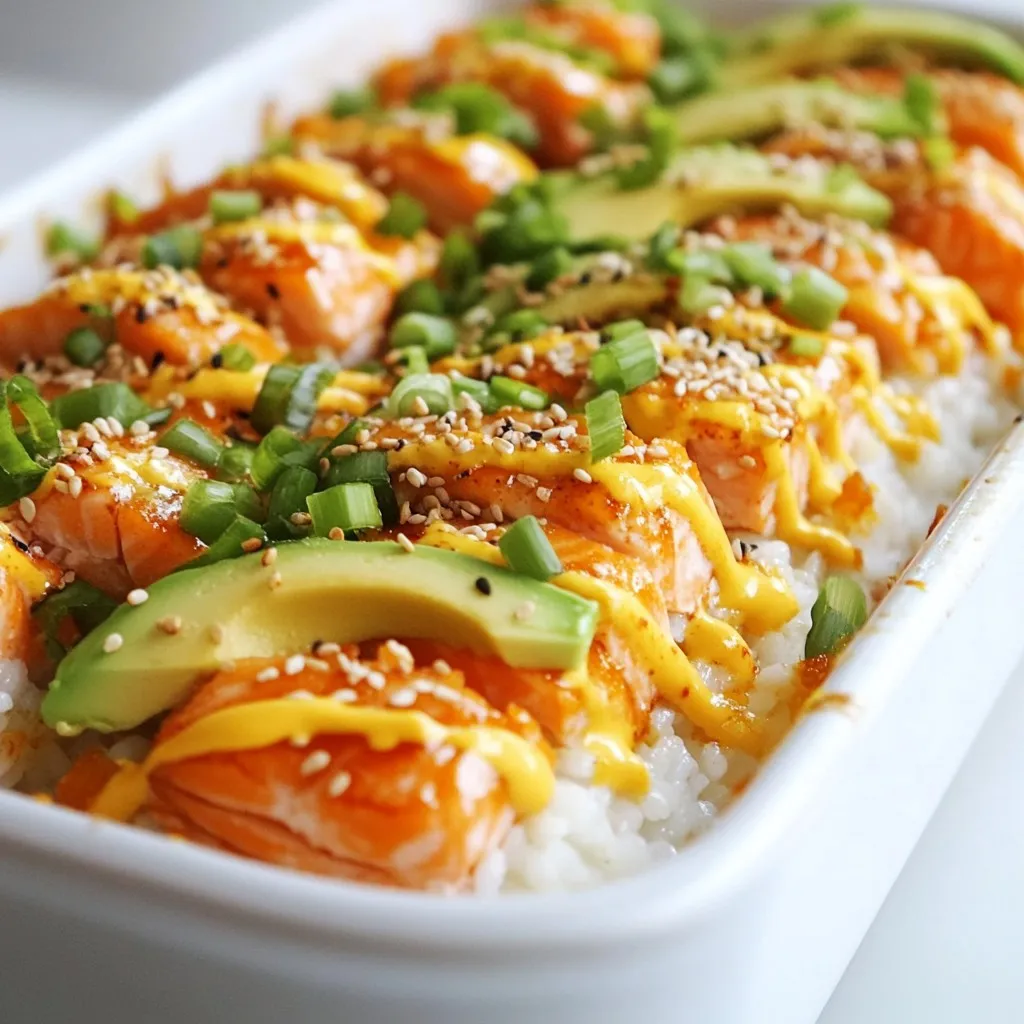 To create a tasty Spicy Salmon Sushi Bake, you need a few key ingredients. First, start with sushi rice. It gives the base a nice sticky texture. You will also need water to cook the rice. Adding rice vinegar, sugar, and salt helps season the rice.