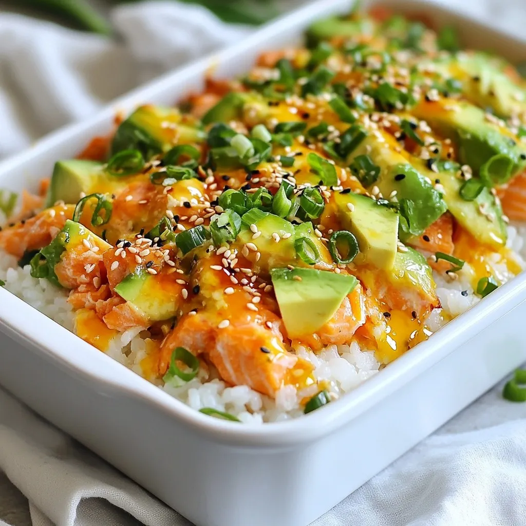 Add Toppings: Sprinkle diced avocado, chopped green onions, and sesame seeds over the salmon layer. Bake for about 15-20 minutes, or until heated through and edges are golden brown.