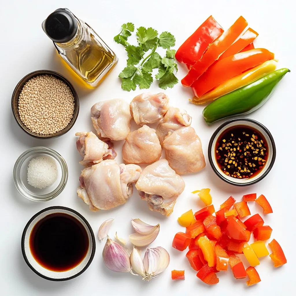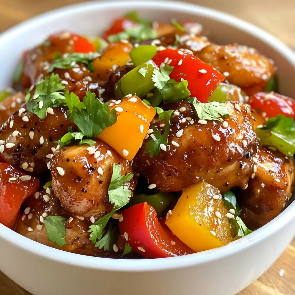 A flavorful dish featuring marinated chicken thighs stir-fried with bell peppers and garnished with sesame seeds and cilantro.