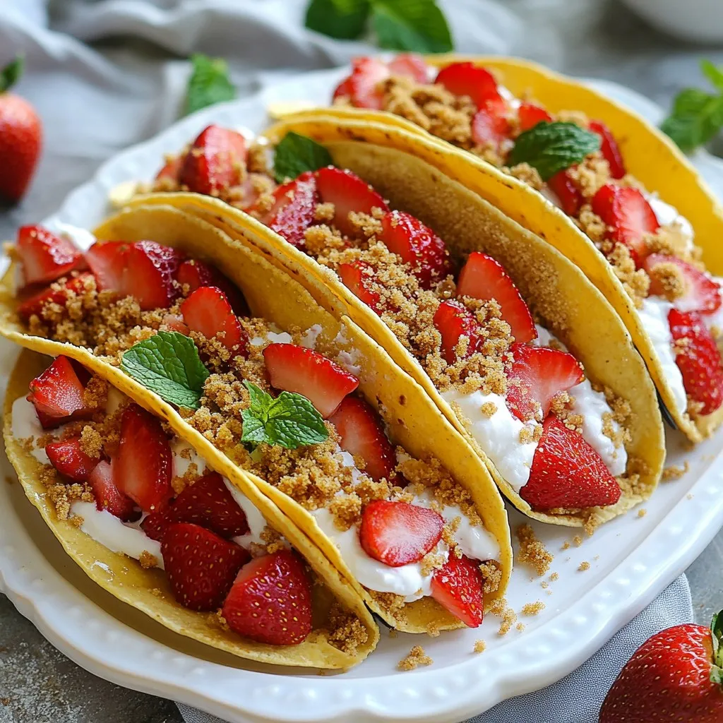 Delightful taco-shaped desserts filled with creamy cheesecake, fresh strawberries, and a crunchy graham cracker topping.