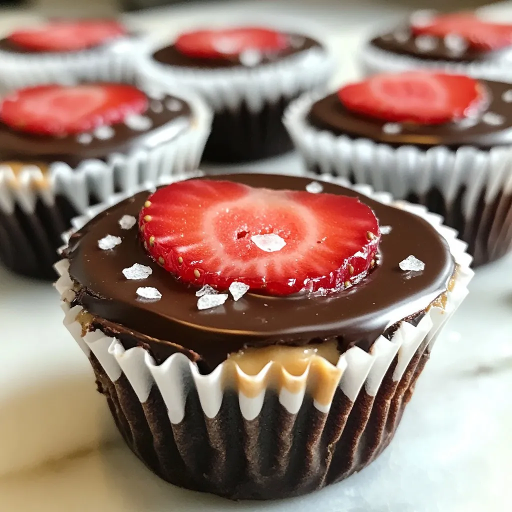 Sprinkle a pinch of sea salt on each cup. This balances the sweetness and enhances the flavors. Place the muffin tin back in the freezer for 30-40 minutes until they are firm. Once set, gently pull the cups from the liners. Serve chilled or let them come to room temperature for a different texture. Enjoy your Strawberry Peanut Butter Cups!