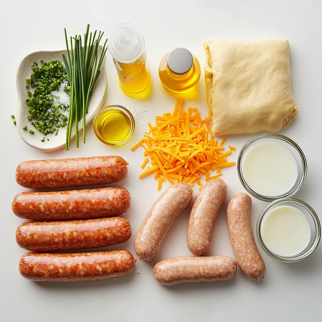 These ingredients are key to making tasty breakfast pigs in a blanket. The breakfast sausages bring a savory flavor that pairs well with the buttery crescent roll dough. The eggs and milk add richness, while the cheddar cheese gives a nice melt and flavor. Chives or green onions add a fresh touch. Remember to season well with salt and pepper for the best taste.