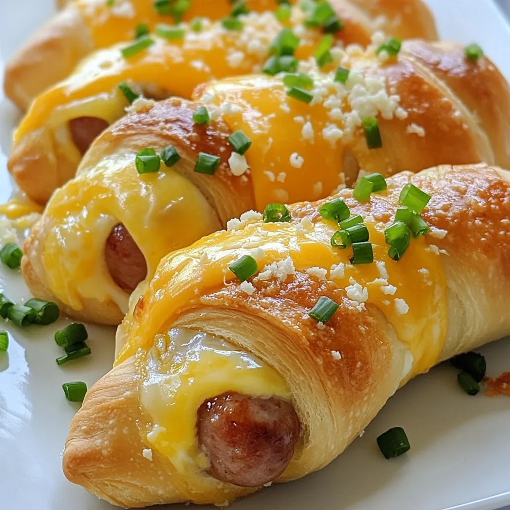 Delicious breakfast sausages wrapped in crescent roll dough, topped with a cheesy egg mixture.