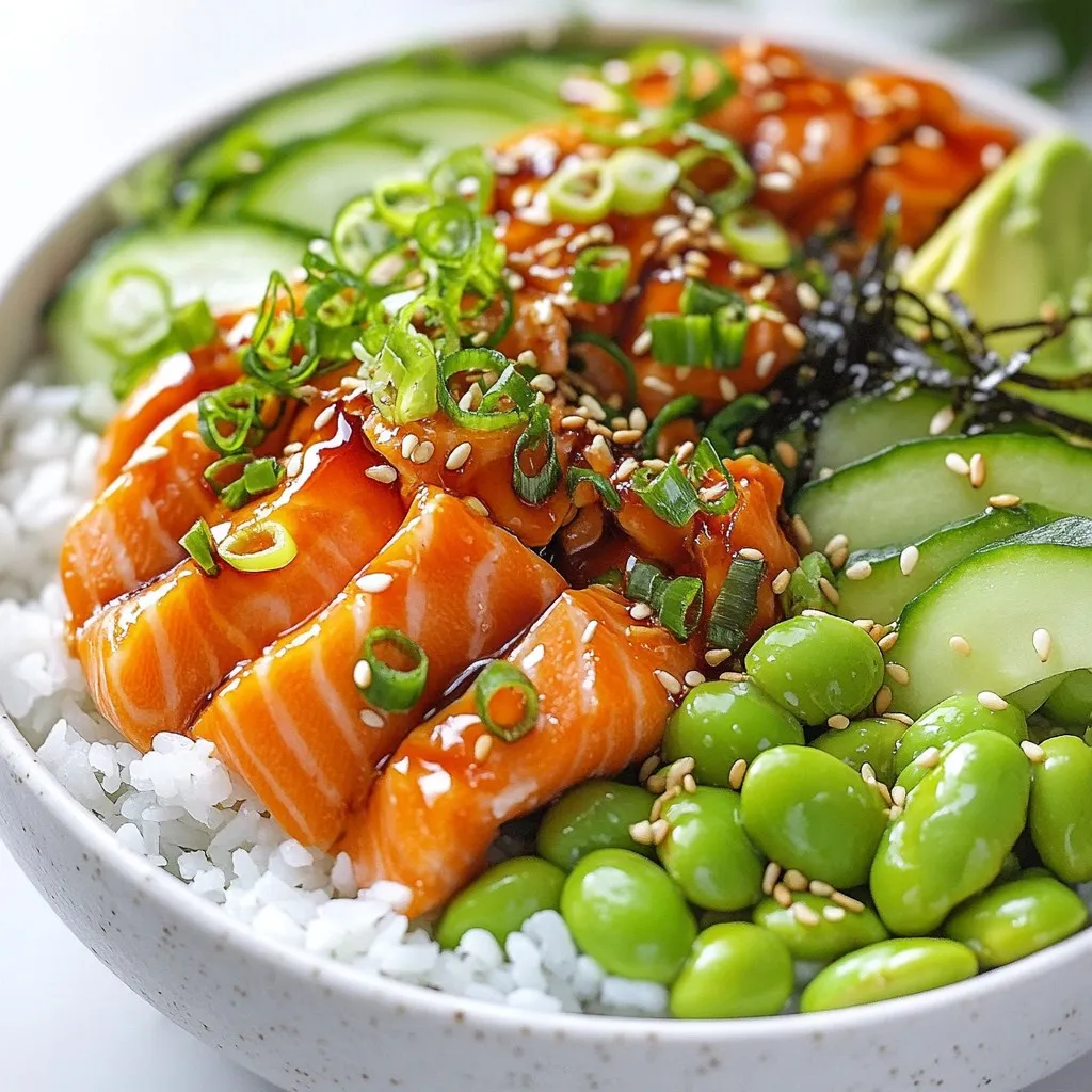 Take four bowls and divide the sushi rice among them. This rice serves as the base. On top, add the slices of salmon, avocado, cucumber, and cooked edamame. Arrange them nicely for a great look. To finish, sprinkle the chopped green onions and toasted sesame seeds over each bowl. Add strips of seaweed for garnish and drizzle with spicy mayo if you want some heat. Enjoy!