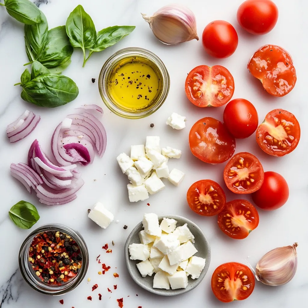 First, gather all your ingredients. You need 300g of pasta, like penne or rigatoni. Next, cut 400g of cherry tomatoes in half. Dice 1 red onion and chop 3 cloves of garlic. Measure out 3 tablespoons of olive oil, 1 teaspoon of dried oregano, and ½ teaspoon of red pepper flakes if you want heat. Don’t forget salt and pepper for taste. Lastly, have 200g of cubed feta cheese, 100g of shredded mozzarella, and ½ cup of fresh basil leaves ready. Preheat your oven to 200°C (400°F) now.