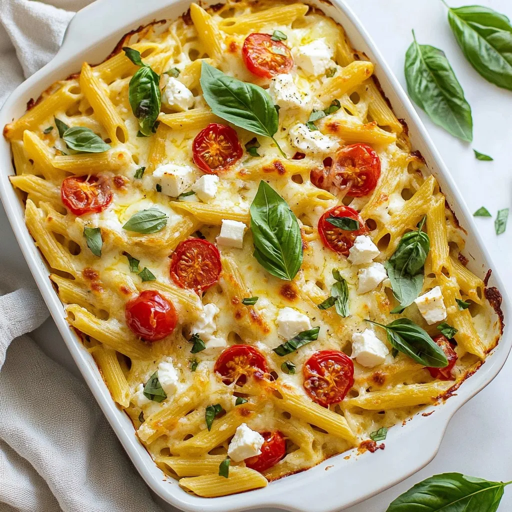 A delicious baked pasta dish featuring feta cheese, cherry tomatoes, and fresh basil.