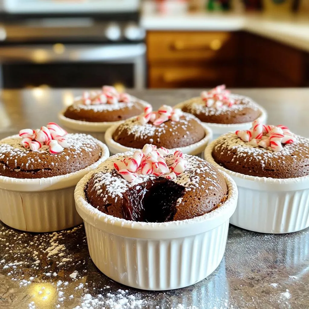 - 1/2 cup unsalted butter - 1 cup semisweet chocolate chips - 2 large eggs - 2 large egg yolks - 1/2 cup granulated sugar - 1/4 teaspoon salt - 1 teaspoon vanilla extract - 1/2 teaspoon peppermint extract - 1/4 cup all-purpose flour - Powdered sugar - Crushed candy canes You can swap unsalted butter for coconut oil. This change adds a hint of coconut flavor. For a dairy-free option, use vegan chocolate chips instead of semisweet chocolate. You can replace granulated sugar with coconut sugar for a healthier choice. If you lack peppermint extract, use almond extract for a different taste. Use gluten-free flour if you want a gluten-free version. Start by preheating your oven to 425°F (220°C). Take four ramekins and grease them with unsalted butter. Dust the insides lightly with cocoa powder. This helps the cakes release easily after baking. In a microwave-safe bowl, combine 1/2 cup of unsalted butter and 1 cup of semisweet chocolate chips. Heat this mixture for 30 seconds at a time, stirring after each interval. Keep heating until it melts and becomes smooth. Let it cool a bit so it mixes well later. In another mixing bowl, crack two large eggs and add two egg yolks. Add 1/2 cup of granulated sugar and 1/4 teaspoon of salt. Whisk them together until the mixture is light and frothy. This step adds air, making your cakes fluffy. Once the chocolate mix has cooled, pour it into the egg mixture. Add 1 teaspoon of vanilla extract and 1/2 teaspoon of peppermint extract. Stir gently until well mixed. Next, fold in 1/4 cup of all-purpose flour using a spatula. Mix until just combined. Don’t overmix, or the cakes will be dense. Use a ladle to fill each ramekin with batter, about 3/4 full. This allows the cakes to rise. Place them in the oven and bake for 12 to 14 minutes. The edges should be firm, but the centers should be soft. After baking, let them sit for 1 minute. Carefully invert each ramekin onto a plate to release the cakes. Enjoy the warm chocolate peppermint goodness! To get that gooey lava center, timing is key. Bake the cakes for 12-14 minutes. The edges will look set, but the center should jiggle slightly. If you bake too long, the lava will turn into cake. Keep a close watch! One common mistake is overmixing the batter. This can lead to a dense cake instead of a light one. Another mistake is not greasing the ramekins properly. This can make it hard to release the cakes after baking. Always dust them with cocoa powder after greasing. You’ll need a few basic tools for these cakes. Use: - Four ramekins - A microwave-safe bowl for melting chocolate - A whisk for mixing the eggs - A spatula for folding in the flour - An oven mitt to handle hot ramekins These tools will help you create perfect lava cakes every time! {{image_4}} To make gluten-free lava cakes, simply swap the all-purpose flour for a gluten-free blend. Many store-bought blends work well. Look for one that contains xanthan gum, as it helps bind the ingredients. This change keeps the texture light and fluffy. The flavor stays rich and chocolatey, making it hard to tell it’s gluten-free. For a vegan twist, replace the eggs with a flaxseed mixture. Mix one tablespoon of ground flaxseed with three tablespoons of water. Let it sit for five minutes until it thickens. Use dairy-free butter and chocolate chips to keep it vegan. The lava cakes will still be warm, gooey, and delicious. You can easily mix up the flavor. For a mocha version, add one tablespoon of instant coffee to the chocolate mixture. This gives a rich coffee taste. For a raspberry twist, fold in a handful of fresh raspberries into the batter before baking. You can also drizzle raspberry sauce on top after baking for a fruity finish. Try different extracts too, like almond or orange, to create your own unique version. To keep your lava cakes fresh, place them in an airtight container. Store them in the fridge for up to three days. Make sure they cool to room temperature before sealing them. This step helps prevent moisture build-up, which can ruin the texture. You can freeze leftover lava cakes, too! Wrap each cake tightly in plastic wrap. Then, place them in a freezer-safe bag or container. They can last up to three months in the freezer. When you're ready to enjoy them, simply thaw them in the fridge overnight. To reheat, preheat your oven to 350°F (175°C). Place the lava cake on a baking sheet and warm it for about 10 minutes. This method helps restore that delicious gooey center. If you're in a hurry, you can also use the microwave. Heat for 15-20 seconds, but be careful not to overdo it. Enjoy your warm chocolate peppermint lava cake as if it just came out of the oven! Serve warm chocolate lava cakes right away. They taste best fresh from the oven. Place the cake on a plate. Dust it lightly with powdered sugar. Add crushed candy canes for a festive touch. A scoop of vanilla ice cream pairs well too. The cold ice cream melts into the warm cake, creating a great mix. Yes, you can make the batter ahead. Prepare it and store it in the fridge for up to 24 hours. Just remember to cover the bowl tightly. When you're ready to bake, bring the batter to room temperature. Then, pour it into the ramekins and bake as directed. Check the edges of the cakes for firmness. They should look set and not jiggle. The centers should remain soft and slightly wobbly. A good rule is to bake them for 12-14 minutes. Keep an eye on them to avoid overbaking, which can ruin the lava effect. Absolutely! You can try dark chocolate for a richer flavor. Milk chocolate will make the cakes sweeter. White chocolate is also an option, but it won't have the same lava effect. Just adjust the sugar levels if you switch to a sweeter chocolate. To adjust sweetness, change the sugar amount. Use less sugar if you prefer less sweetness. You could also add a pinch of salt to balance the flavors. If using sweeter chocolate, cut back on sugar too. Taste the batter before baking to find your perfect balanc