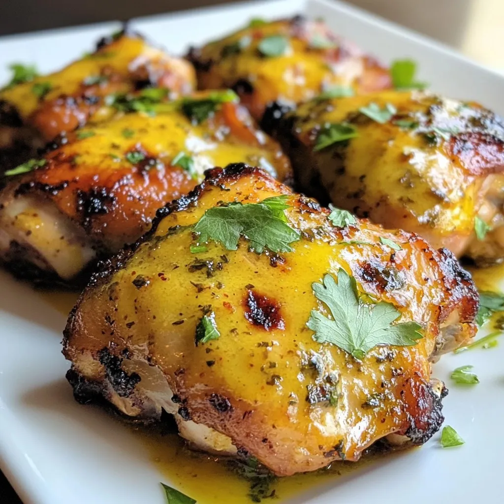Serve the chicken thighs on a large platter. A sprinkle of fresh cilantro or parsley adds color. For sides, rice or a salad works great. You can drizzle olive oil or add lemon slices for extra flair. This meal is perfect for family dinners or gatherings. Enjoy the juicy, flavorful chicken!